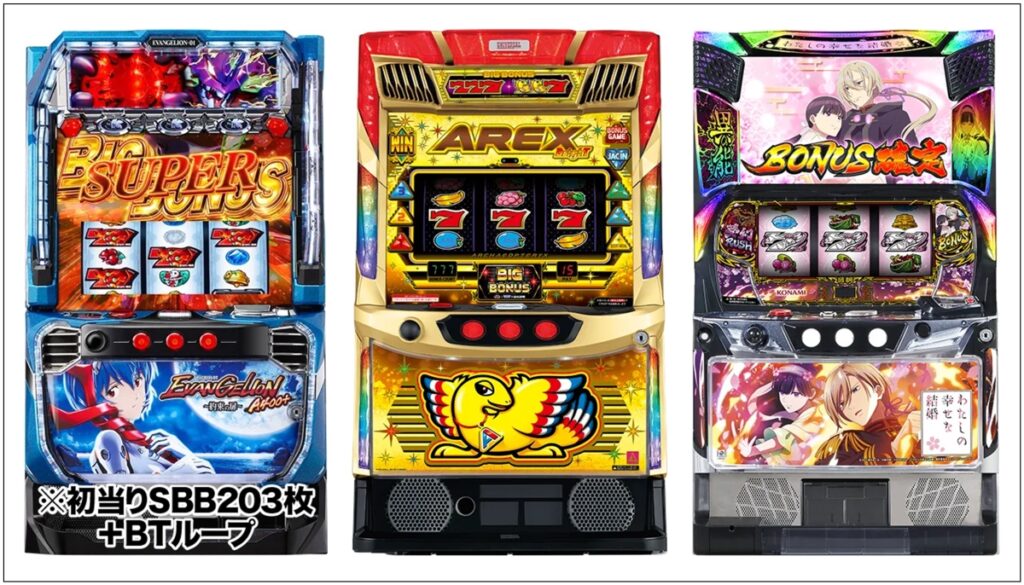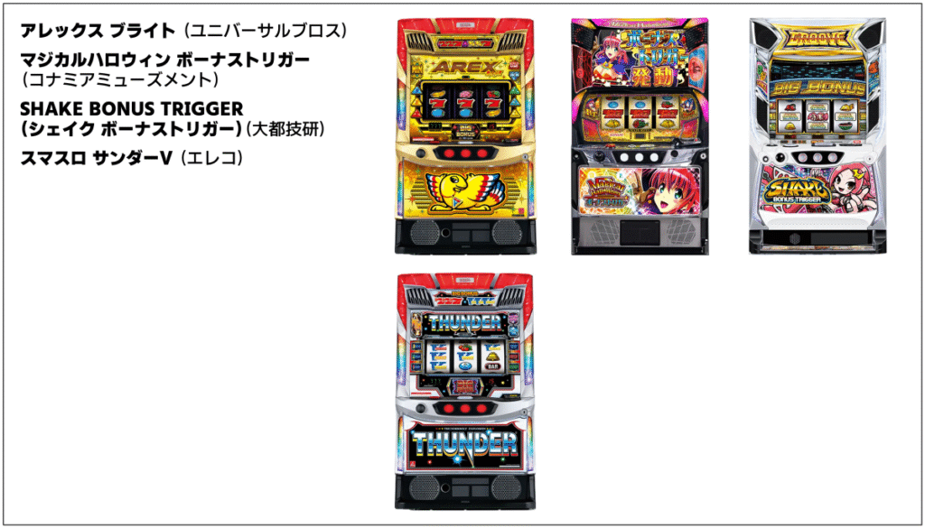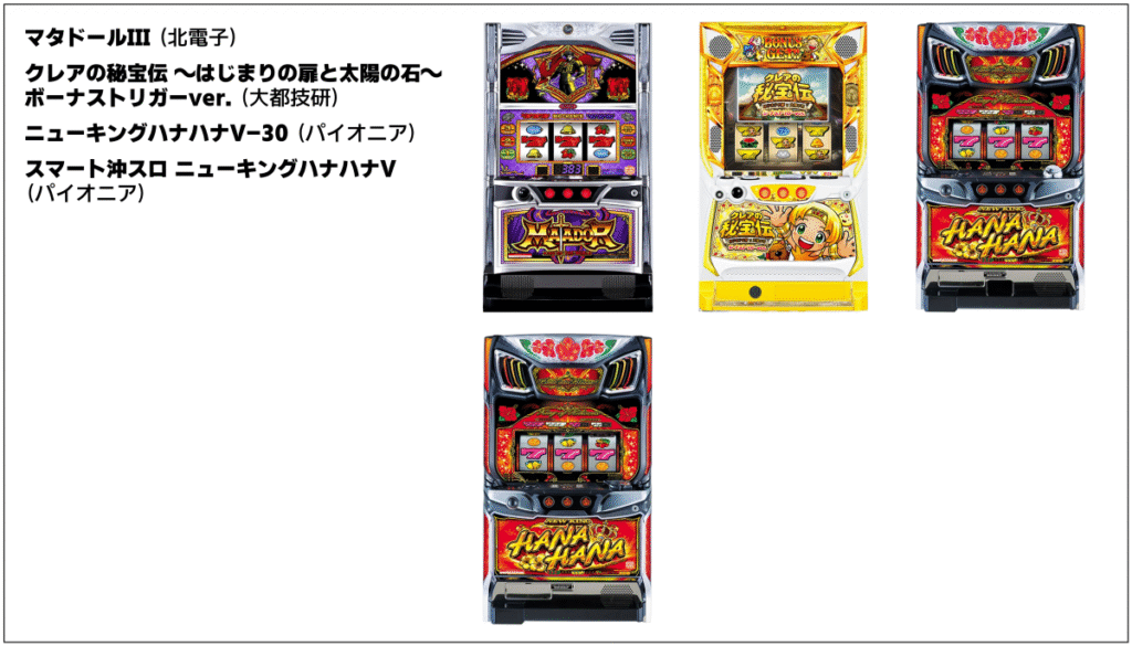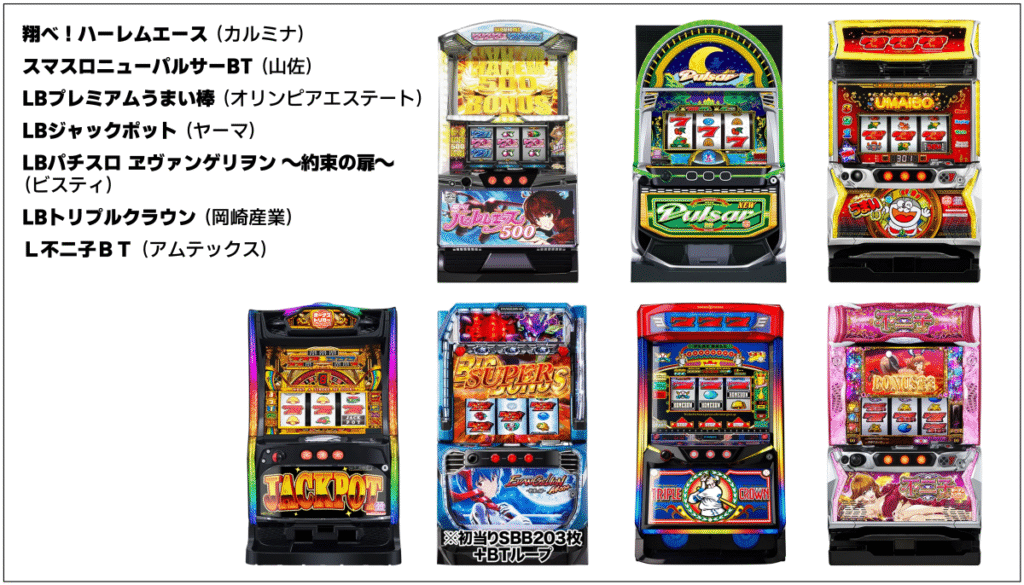 2025年では『LBパチスロ ヱヴァンゲリヲン ~約束の扉~』が約12,300台、『スマスロニューパルサーBT』が約7,500台、『クレアの秘宝伝 ~はじまりの扉と太陽の石~ ボーナストリガーver.』が約6,300台導入されています。