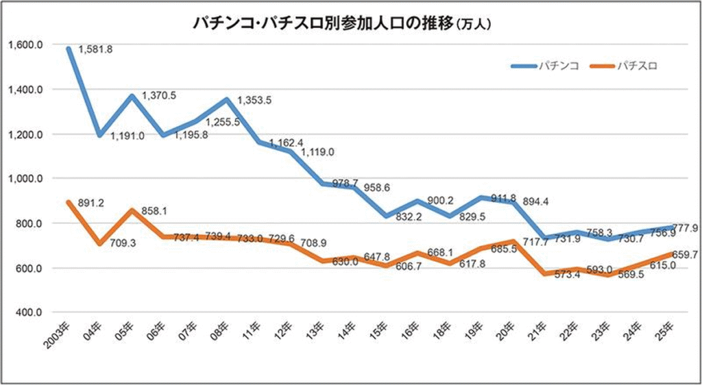 また、パチンコ・パチスロに分けた参加人口の推移を見ると、2025年はパチンコが777.9万人、パチスロが659.7万人でこちらも2年連続の増加となっています。そして2024年からのパチスロ参加人口の増加人数は44.8万人となり、パチンコのを21.0万人を上回っています。