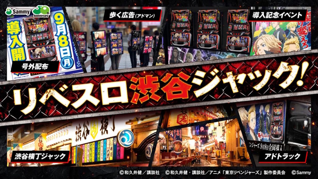 また2025年9月5~18日にはサミー株式会社による『スマスロ 東京リベンジャーズ』のプロモーション「渋谷横丁ジャック」が催され、コンテンツの主なファンである女性層や渋谷の街を楽しむ若年層にもパチスロの楽しさをPRしました。